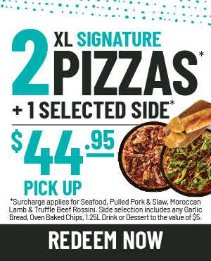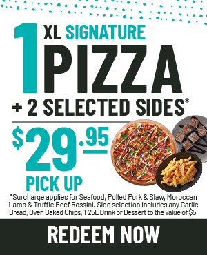 Available only at selected stores*. Side selection includes any Garlic Bread, Oven Baked Chips, 1.25L Drink or Dessert to the value of $5. Additional $5 delivery fee applies to delivery orders. Minimum $25 spend for delivery. Offers exclude Low Carb, Gluten Free and half / half. Additional Surcharges apply for Seafood, Pulled Pork & Slaw, Moroccan Lamb and Truffle Beef Rossini Pizzas. Cannot be used in conjunction with any other. Expires 05/03/21